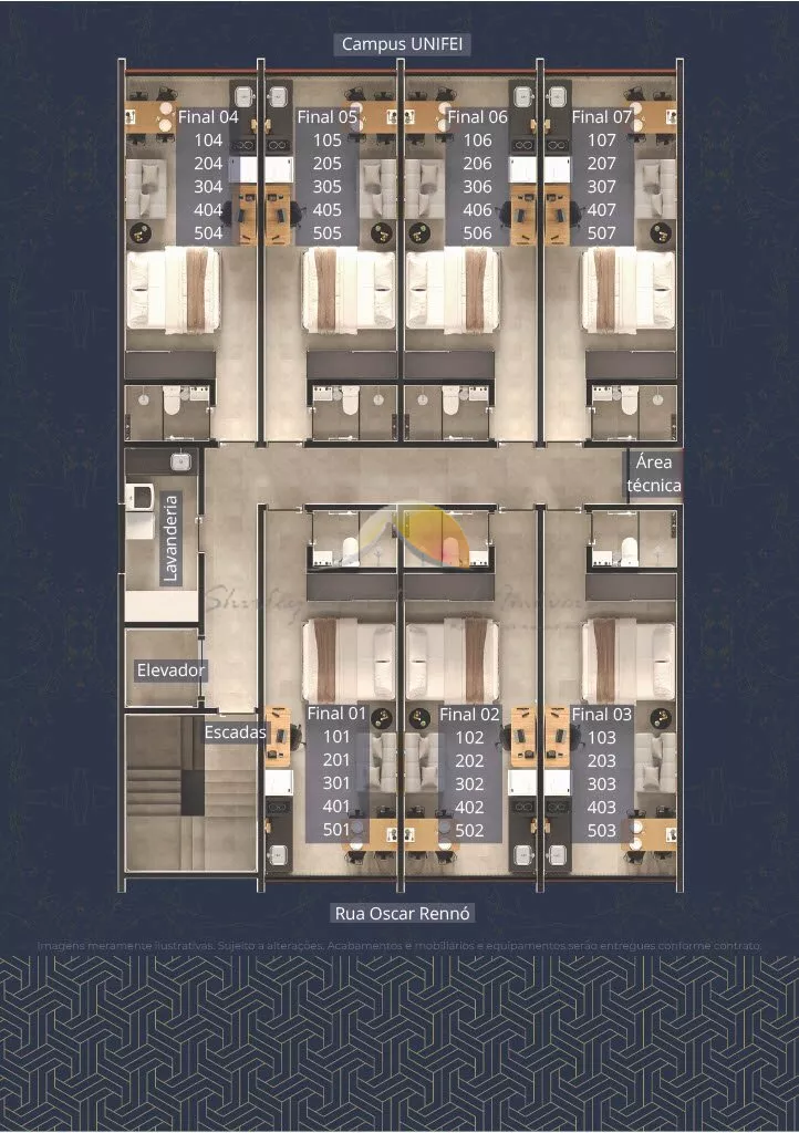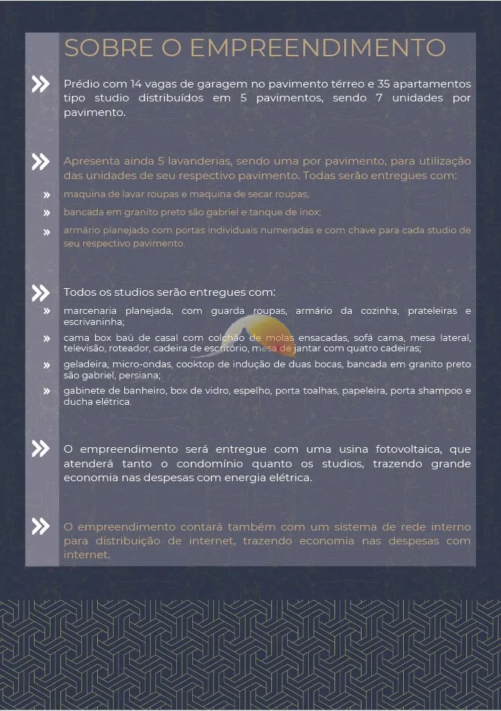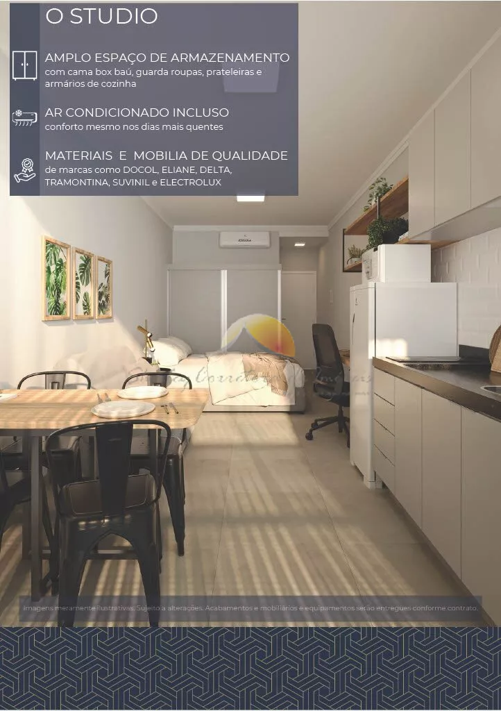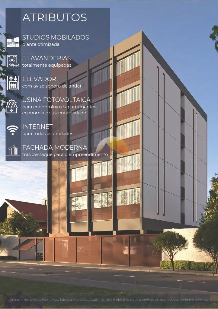 Todos os stúdios serão entregues completamente mobiliados, com um projeto moderno e eficiente, pronto para alugar! Além disso, o condomínio oferece lavanderia em cada andar, vaga de garagem (vendida separadamente) e energia fotovoltaica.